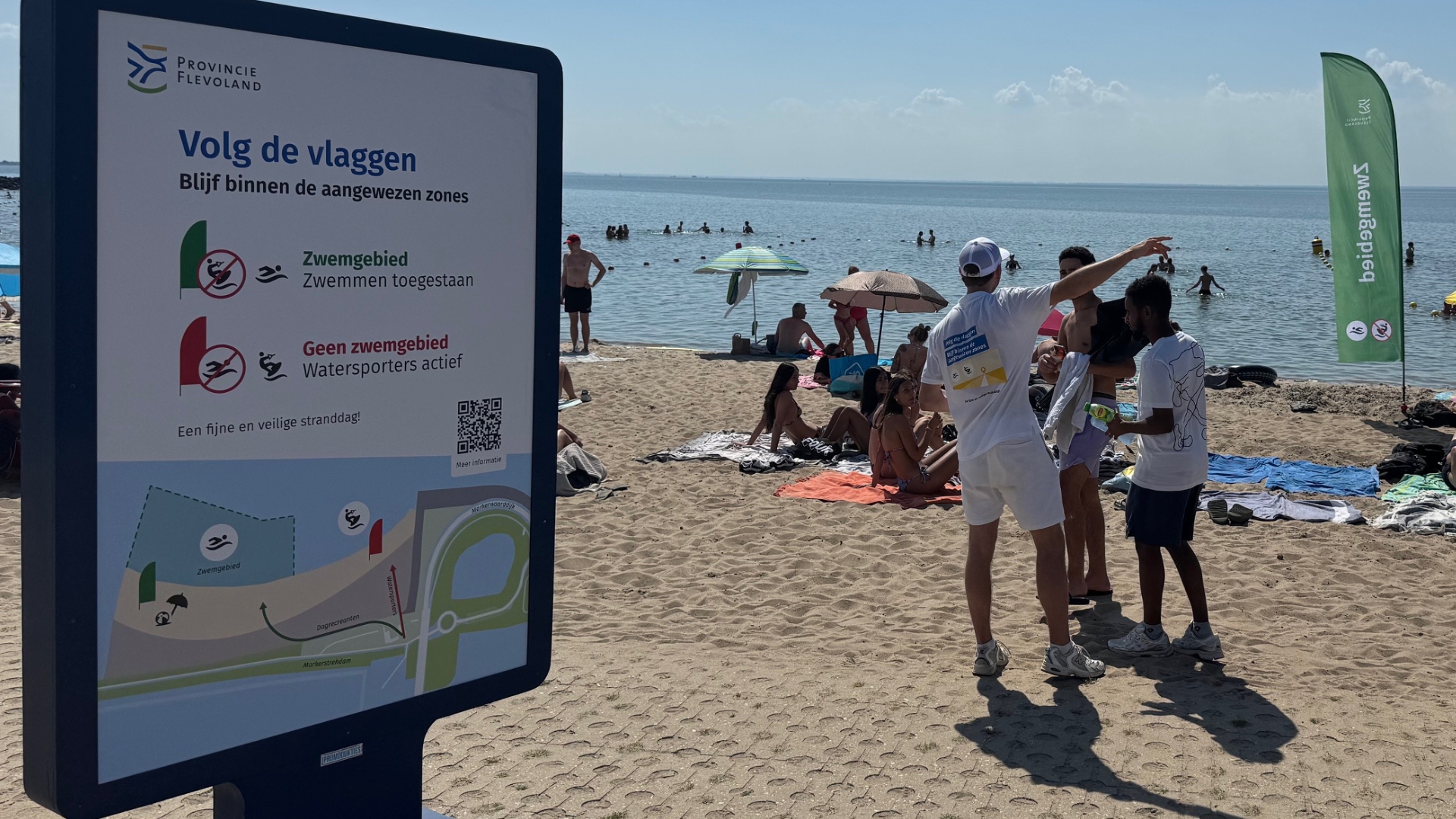 Op een bloedhete en drukbezochte stranddag informeerde het promoteam van Promodukties bezoekers over het gedeelde gebruik. Zwemmers bij de groene vlaggen, watersporters bij de rode. Wie naar de juiste plek ging, kreeg een ijsbon voor Camp & Surf Markermeer.