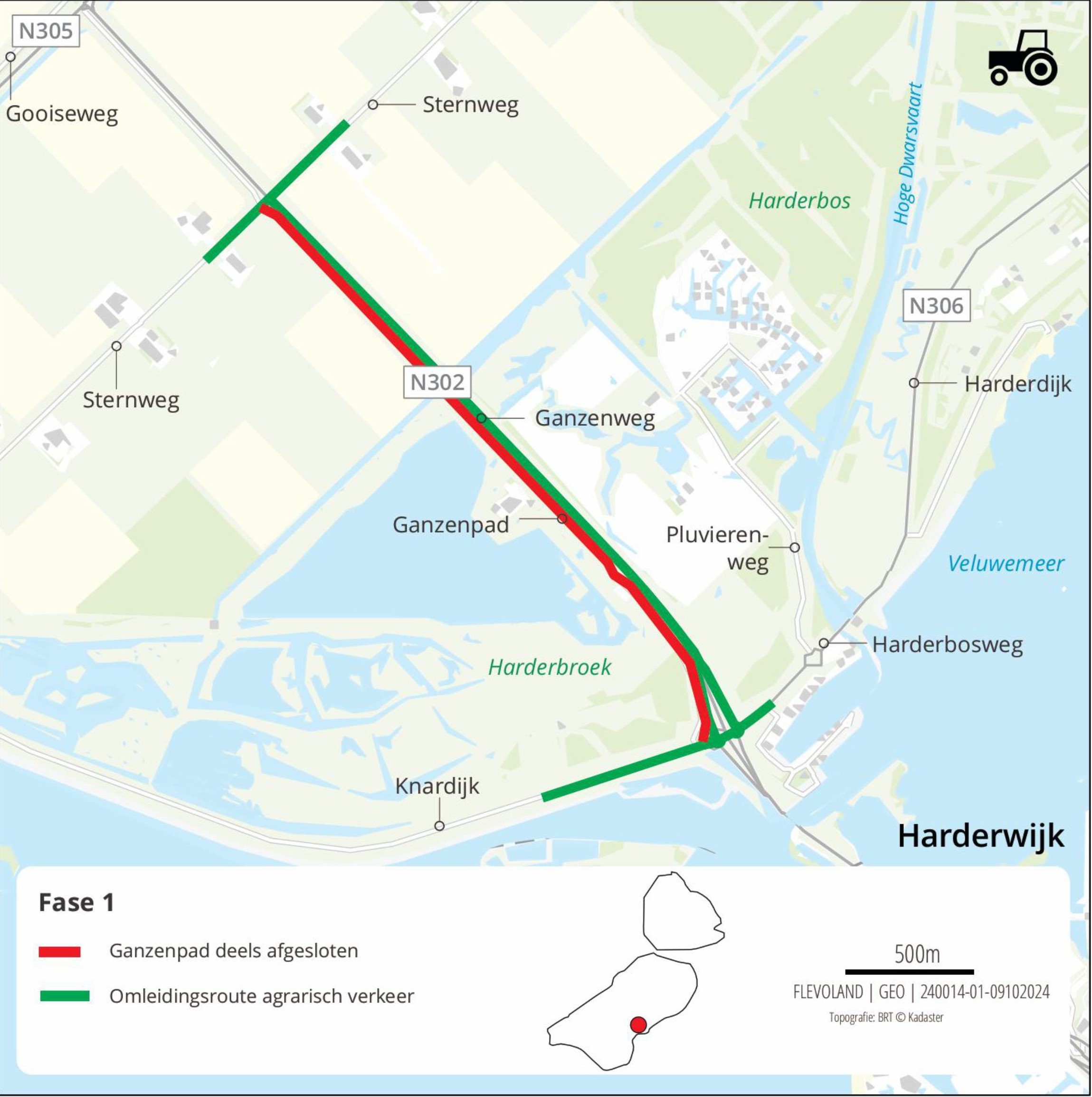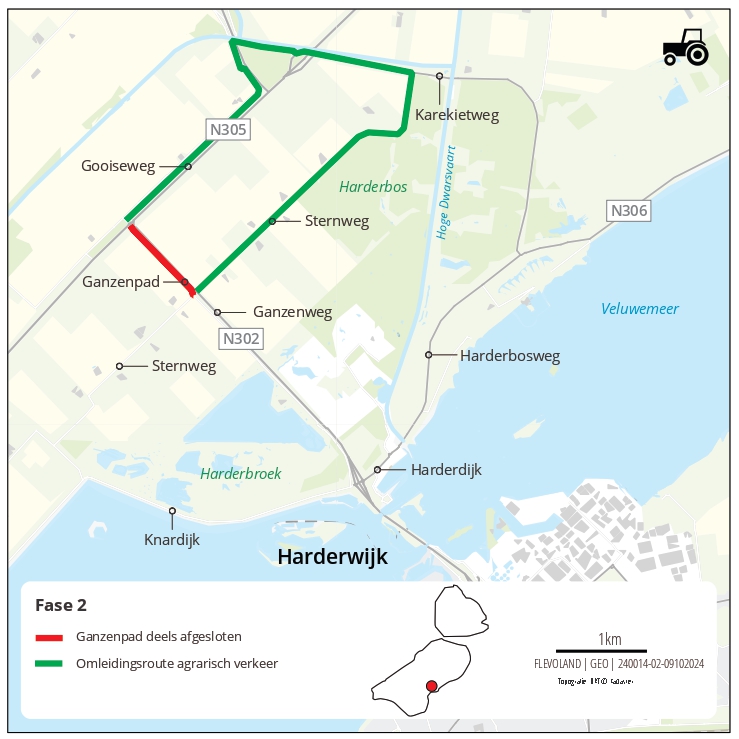 Tijdens deze fase mogen landbouwvoertuigen geen gebruik maken van de Ganzenweg (N302). De kruising met de Gooiseweg is te druk, ook buiten de spits. De omleiding gaat over de Sternweg, Karekietweg, Karekietpad en Futenweg. Omdat deze route niet ideaal is voor lange en brede voertuigen, is gekozen om deze fase na het maaiseizoen te plannen.