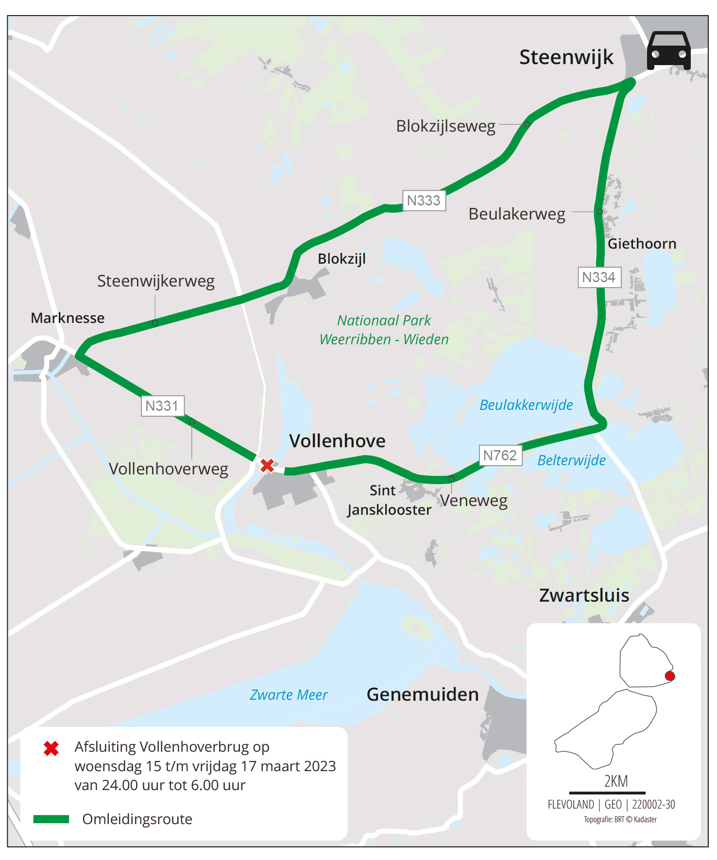 De Vollenhoverbrug krijgt een nieuw bedieningssysteem, net zoals alle andere op afstand bediende bruggen en sluizen in de provincie Flevoland. De werkzaamheden starten op maandag 13 februari en zullen volgens planning op 31 maart zijn afgerond. De Vollenhoverbrug is onderdeel van de provinciale weg N331, die de Vollenhoverweg in Flevoland verbindt met de Flevoweg in Overijssel. Tijdens de werkzaamheden, een periode van zeven weken, kan de brug niet geopend worden en geldt er voor het scheepvaartverkeer een hoogtebeperking van 3,1 meter. Het wegverkeer kan tijdens de werkzaamheden gewoon gebruik blijven maken van de brug, behalve twee nachten waarin de brug getest wordt. Het gaat om de nachten van 15 op 16 maart en van 16 op 17 maart van 24:00 – 6:00 uur.