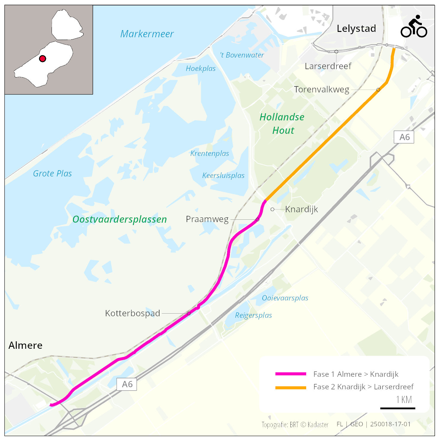 De werkzaamheden starten in november 2025. Naar verwachting loopt deze eerste fase tot het tweede kwartaal van 2026. In deze periode wordt het deel tussen Almere en de Knardijk aangelegd.