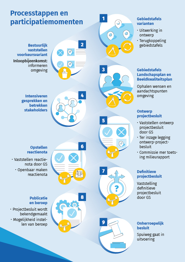 In onderstaande visual kunt u zien welke processtappen er nog genomen gaan worden om te komen tot uiteindelijk een onherroepelijk besluit, waarna de Spuiweg aangelegd gaat worden. Ook kunt u zien wanneer en welke participatiemomenten er nog gaan zijn.