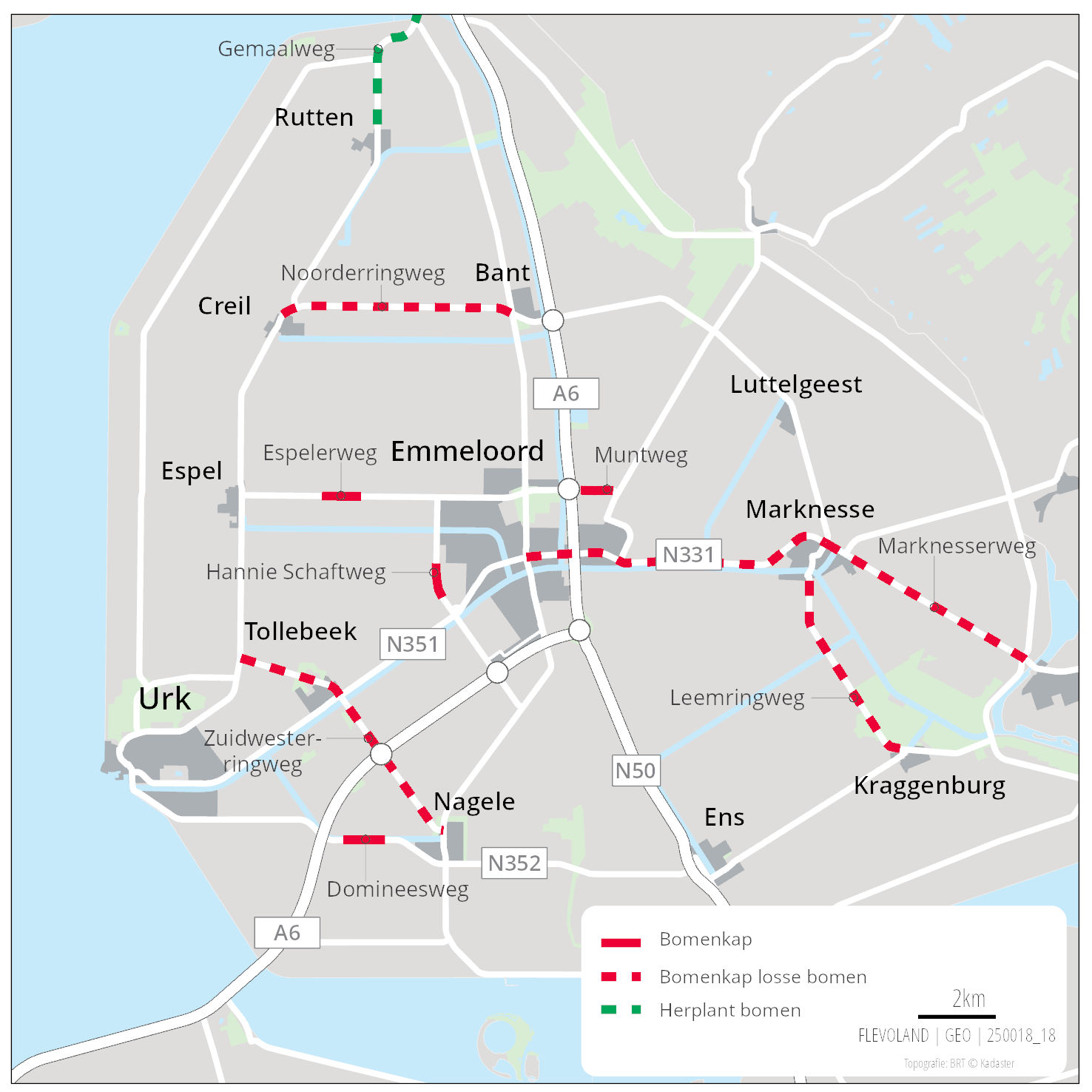 We verwijderen in totaal ongeveer tweehonderd bomen op delen langs de Espelerweg, de Hannie Schaftweg, Domineesweg en de Muntweg. Verder halen we losse zieke bomen weg op meerdere wegen. Dit gaat om bomen langs de Marknesserweg, de Vollenhoverweg, de Leemringweg, de Zuidwesterringweg, de Noorderringweg en de Urkerweg. De aannemer is hier nu mee bezig. Dit werk loopt tot 8 december.