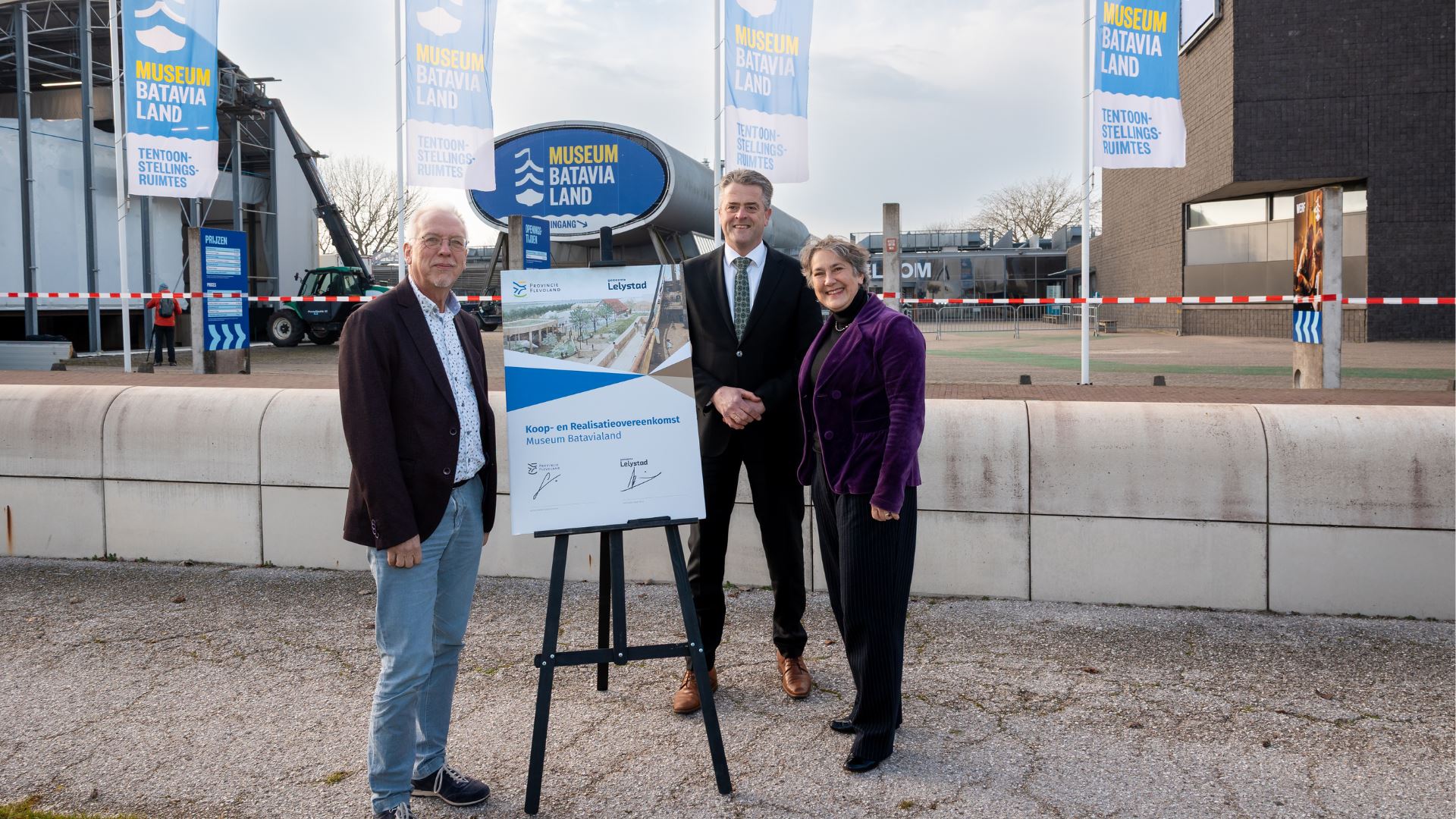 Maandag 19 januari ondertekenden we samen met gemeente Lelystad een overeenkomst voor de overdracht van het perceel ten zuiden van museum Batavialand. Deze grond is nodig voor de bouw van het nieuwe museum Batavialand en voor het plaatsen van het schip De Batavia.
