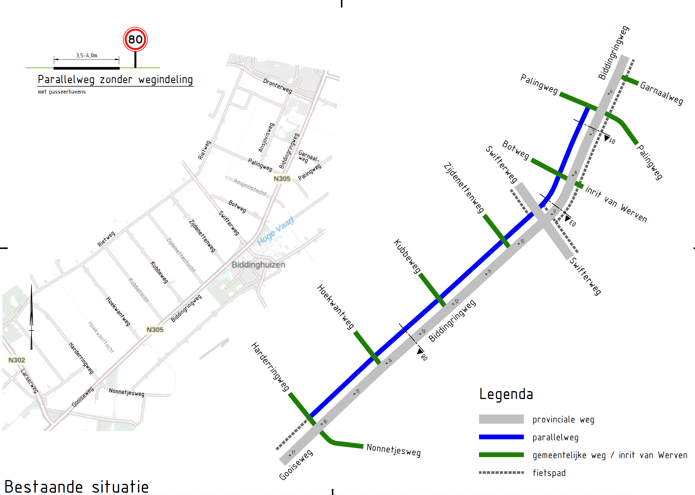 We willen de verkeersveiligheid op de N305 Biddingringweg verbeteren. Daarom gaan we de huidige aansluitingen aanpassen. De aansluitingen met de Palingweg en de Nonnetjesweg voorzien we van verkeerslichten, de overige aansluitingen gaan we afsluiten. Deze maatregelen zijn noodzakelijk om de doorstroming te verbeteren en de verkeersveiligheid te verhogen, conform de geldende landelijke richtlijnen. Ook wordt de gemeentelijke Haringweg aangepast.